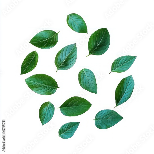 Arrangement of multiple fresh green leaves on a white background showing their veins and textures