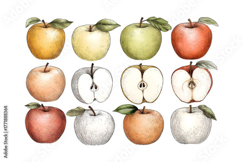 Arrangement of twelve apples showing variety of colors and types including whole and halved fruits on a contrasting surface isolated on transparent background