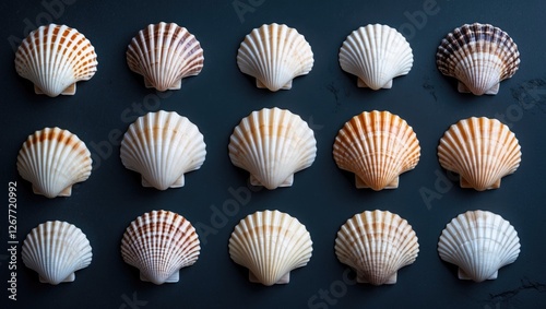 Arrangement of various colorful seashells on a dark surface showcasing detailed textures and patterns with ample Copy Space for text.
