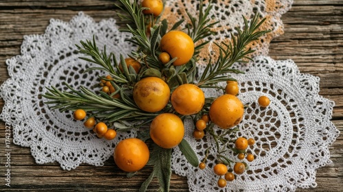 Arrangement of yellow fruits and greenery on lace doily background