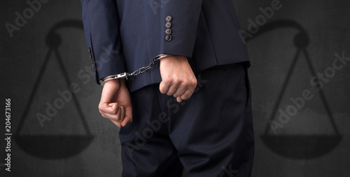 Arrested businessman in handcuffs with hands behind back and justice symbol wallpaper