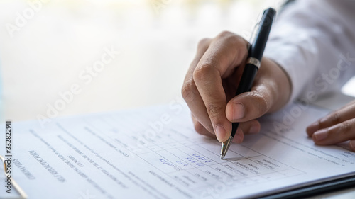 Arrived Asian woman tourist filling a coronavirus self reporting form at international airport. Medical and Health concept.