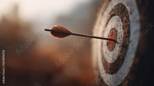 Arrow hitting a targets bullseye. Concept of success, precision, and achieving goals. Metaphor for aim, focus, and hitting the mark. Great for business, strategy, and motivation.