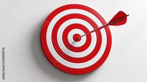 Arrow hitting bullseye on red and white target with a white background, close-up