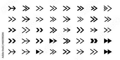 Arrow icon set, arrow cursor collection, different arrow signs, black arrows icons. Modern simple arrows. Black arrow pointing to the right. Black direction pointer. Vector illustration.