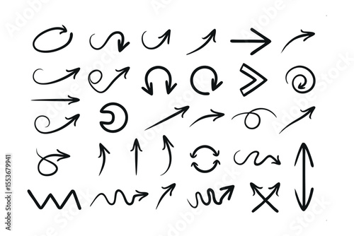 Arrow Variety: A diverse collection of hand-drawn arrows, each with a unique design, showcases versatility in direction and flow, ideal for conveying concepts of movement, navigation, and progress.