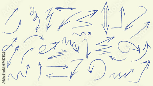 Arrow vector hand drawn sketch icon set. Doodle sketch hand drawn direction element set. Pencil doodle flat line design cartoon elements. Scribble swirl arrow sign. Vector illustration