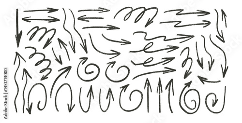 Arrows charcoal drawn. Straight and curved thin pointers doodle elements set. Scribble freehand arrow markers Vector illustration by pencil. Grunge chalk freehand graphic on white background.