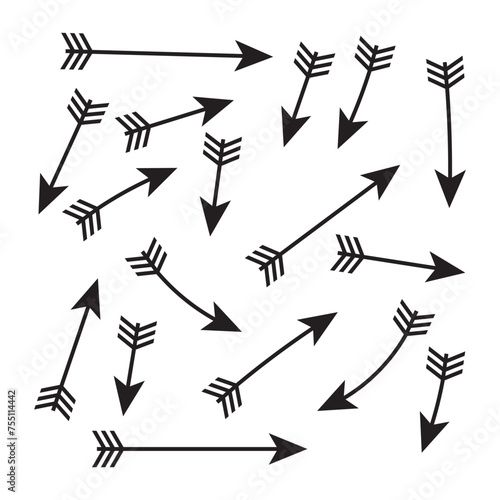 Arrows set, hand drawn doodle direction twist indicators, pointers and scroll elements. Collection of swirly various dynamics shapes. Isolated on white background. Vector illustration eps 10.