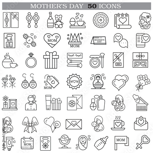 Art & Illustration A collection of minimalistic line icons themed around Mother's Day, Mother's Day Line Icons Set