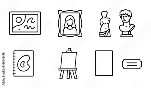 Art and sculpture linear icons – outline style for creativity and museum explorers: painting, portrait, statue, bust, sketchbook, easel, canvas, museum pass