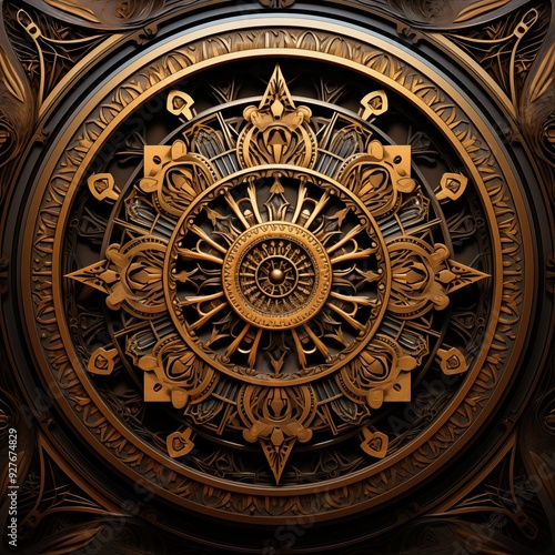 Art deco mandala. Intricate circular design featuring ornate patterns and textures in gold and black, resembling a decorative mandala or compass rose.