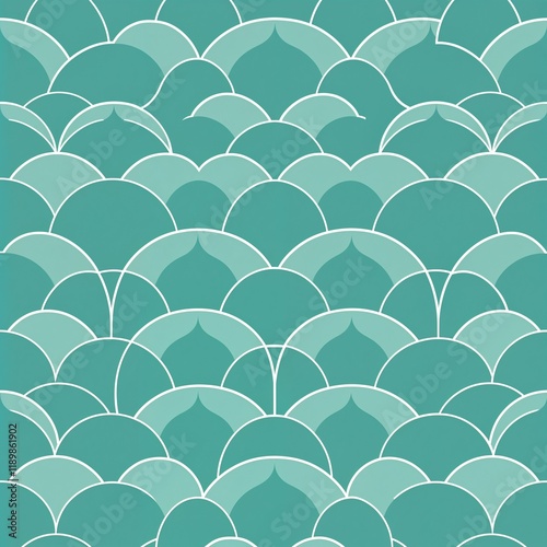 Art Deco seamless pattern of overlapping teal semi-circles, each outlined in white, with a subtle mosaic texture. Direct harsh shadows, earthy and cozy tones.