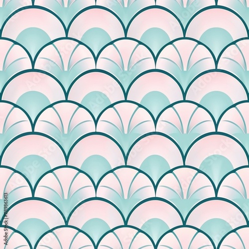 Art Deco seamless pattern of overlapping teal semi-circles, each outlined in white, with a subtle mosaic texture. Direct harsh shadows, earthy and cozy tones.