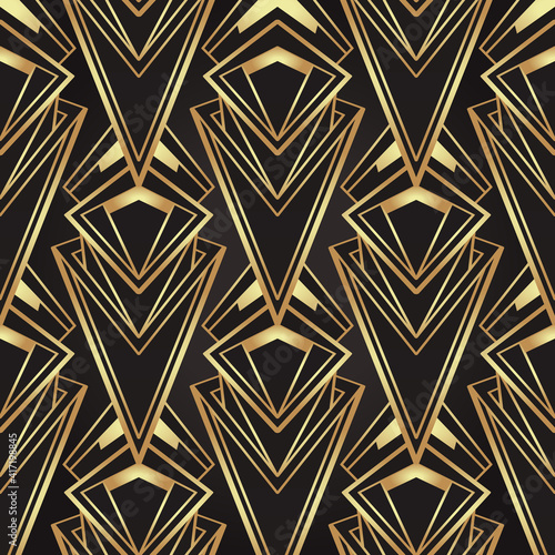Art deco style geometric seamless pattern in black and gold. Vector illustration. Roaring 1920 s design. Jazz era inspired . 20 s. Vintage Fabric, textile, wrapping paper, wallpaper.