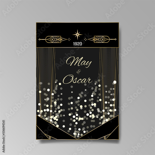 Art Deco template golden-black white, A4 page, menu, card, invitation, Sun and city lights in a Art DecoArt Nuevo style