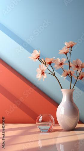 Art minimal aesthetic. Creative concept. Copy space. Still life with flowers in vase on blue and orange wall with shadow in form of line.