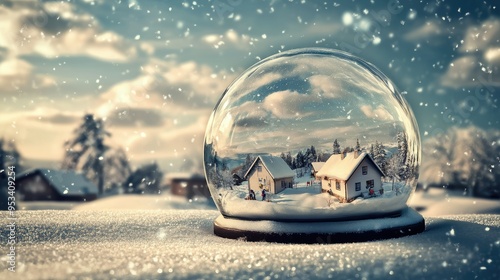 Art photography, snow globe, small town inside the snow globe, winter , beautiful sky, snow, happy people inside the snow globe, 3d
