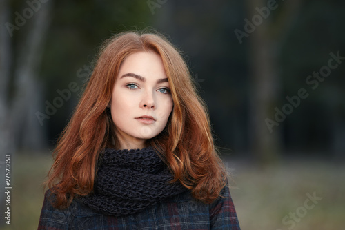 Art portrait of young elegant redhead woman in scarf and plaid jacket with blurred forest background outdoors