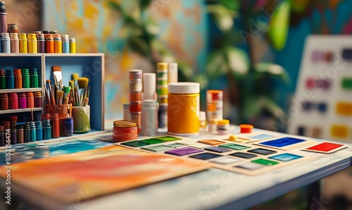 Art supplies, colorful paints, and brushes.