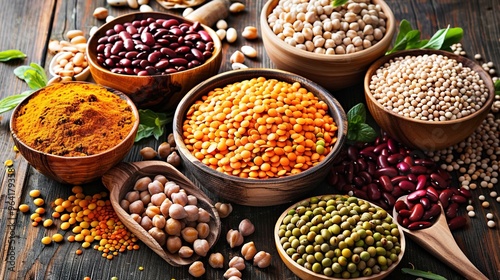 Artful Display of Beans and Legumes: Chickpeas, Red Beans, and More in Bowls on a Wooden Table, Accented with Stones and Wooden Spoons