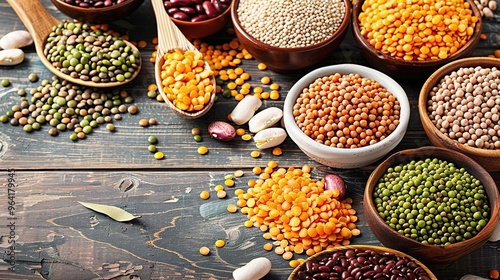 Artful Display of Beans and Legumes: Chickpeas, Red Beans, and More in Bowls on a Wooden Table, Accented with Stones and Wooden Spoons