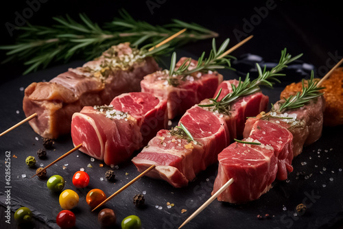 Artfully arranged on a dark background, these raw pork neck skewers are garnished with rosemary, sea salt, garlic, and a tantalizing blend of spices. generative AI.