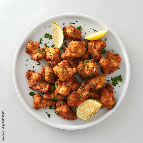 Artfully Arranged Plate of Perfectly Fried Chicken Pieces with Fragrant Spices and Fresh Lemon Garnish