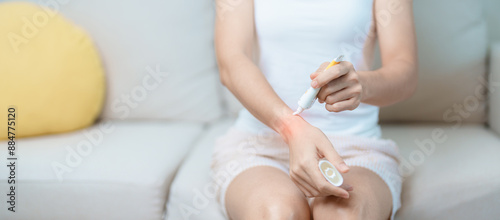 Arthritis and Muscle Pain Relief Cream concept. Woman having wrist pain at home, muscle ache due to De Quervain s tenosynovitis, ergonomic, Carpal Tunnel Syndrome or Office syndrome and Parkinson