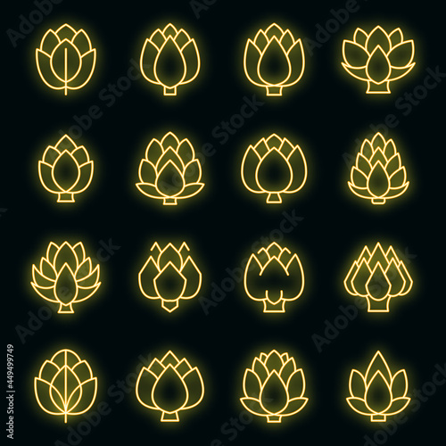 Artichoke icons set. Outline set of artichoke vector icons neon color on black
