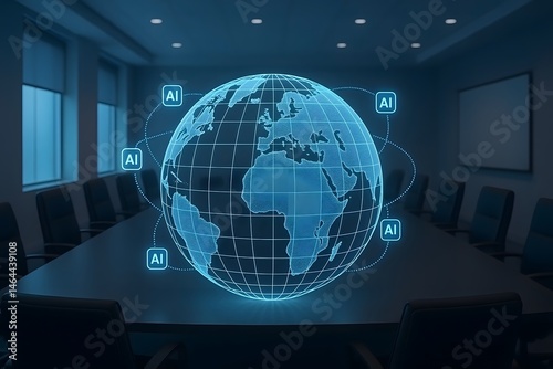 Artificial intelligence and global network visualization in a corporate meeting room demonstrating modern technology and data analysis