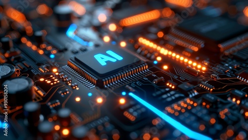 Artificial Intelligence chip with "AI" written on it, on a circuit board background. Blue light from the chip illuminates part of the circuitry.