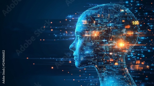 Artificial Intelligence. Human head with glowing circuitry and data, blue background.