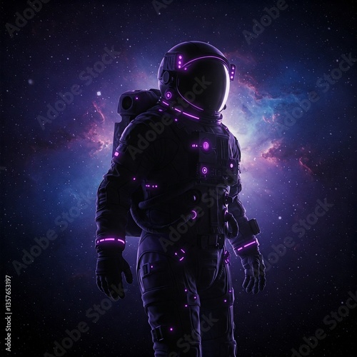 Artificial Intelligence Image: Purple and black astronaut floats in space, mystery, vastness, solitude, admiration.