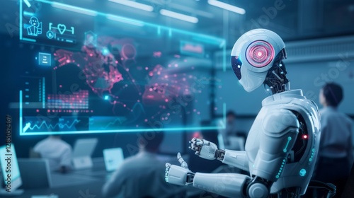 Artificial Intelligence in Action: A cutting-edge, modern robot interacts with an interactive holographic display in a futuristic technology center.