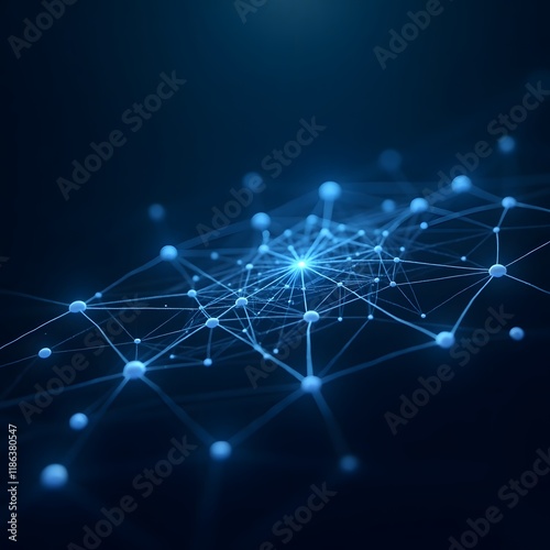 Artificial intelligence network. Abstract image of a digital network illuminated by blue light, showing interconnected nodes and lines on a dark background.