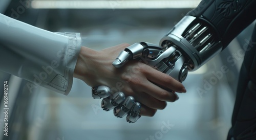 Artificial intelligence robot hand shaking human hands, concept of artificial smart technology and machine learning in business.