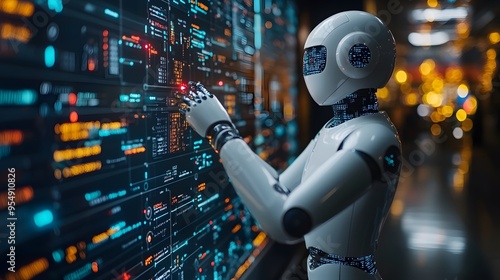 Artificial intelligence technology enhancing business operations, with a chatbot for customer service and digital marketing data analytics displayed.