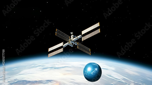 Artificial Satellite Orbiting Blue Planet Earth Against Dark Starry Space Background