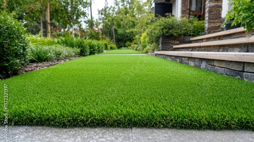 Artificial turf lawn stretches from house to street, bordered by lush landscaping and stone steps. Bright green grass, detailed texture.