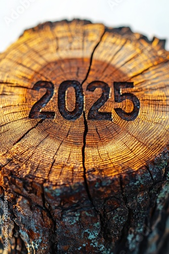 Artificially Carved Wooden Numbers Depicting the Year 2025 on Tree Surface
