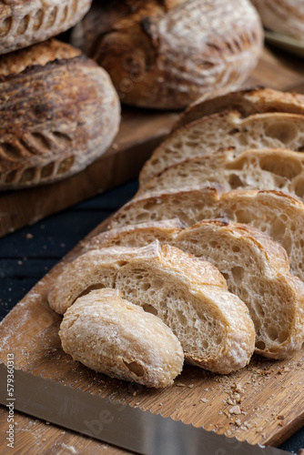 Artisan Batard Sourdough healthy Bread with leaf scoring. Open crumb high hydration Sourdough bread set on white table.