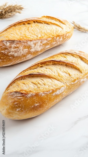 Artisan bread loaves, just out of the oven, are beautifully arranged on a polished marble countertop, accented by natural elements