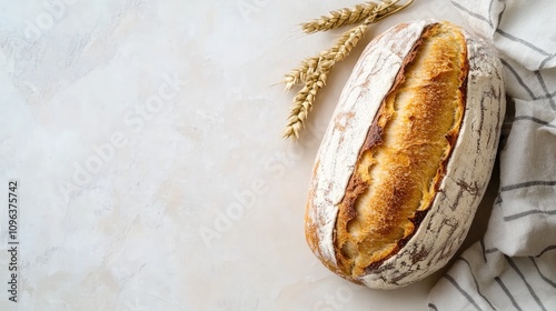 Artisan crusty loaf of bread with golden crust resting on a light background, accompanied by wheat stalks and a textured cloth.