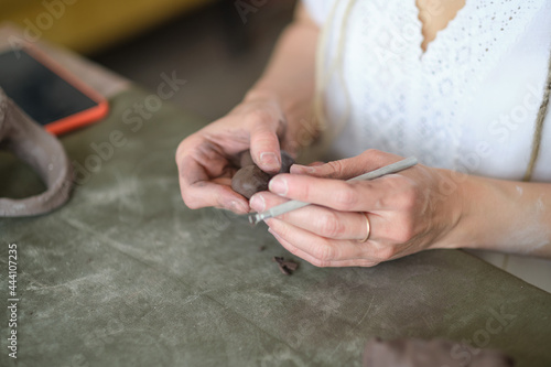 artisan pottery tutor. women's hands shake a piece of gray clay. Pottery made of clay with their own hands. Holding a grey ball