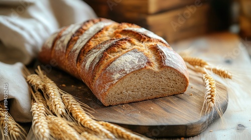 Artisan Rye Bread Loaf Displayed on Wooden Cutting Board with Wheat Stalks and Soft Linen Cloth Rustic Bakery Scene