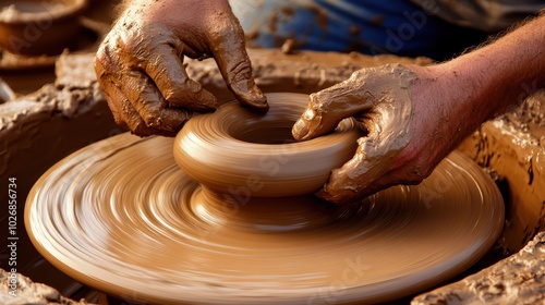 Artisan shaping clay on a pottery wheel, creating beautiful handmade pottery.