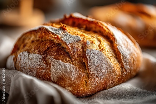 Artisan sourdough bread loaf, crispy golden crust with flour, on linen.