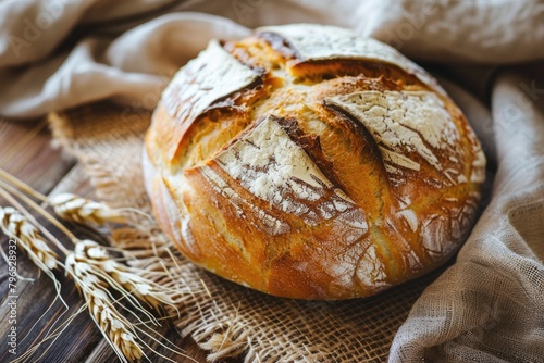 Artisan Sourdough Bread on Rustic Table with Wheat Stalks