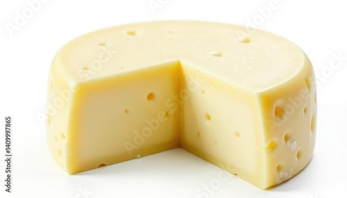 Artisan wheel of creamy white cheese, isolated , cut, milk